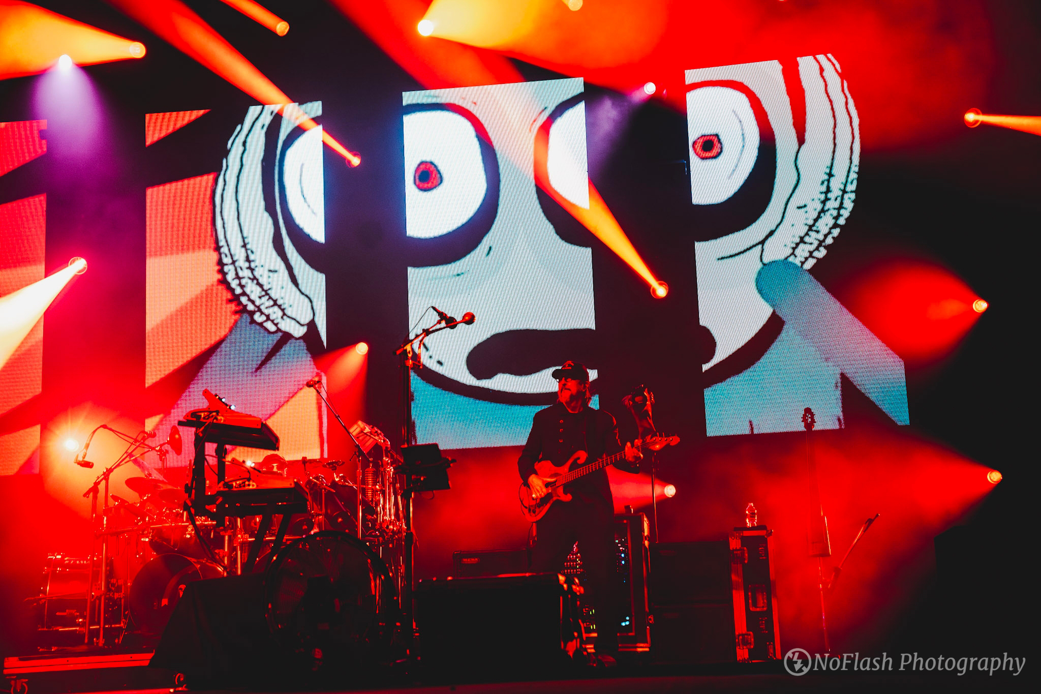 As Primus took the stage, the atmosphere in the venue shifted from energetic anticipation to a palpable sense of curiosity and excitement, with the iconic chants of “Primus sucks” echoing throughout. From the first note, it was clear that this would be a performance unlike any other. Opening with the classic “Those Damned Blue-Collar Tweekers,” fans were instantly thrust into Primus’ world, complete with clips and images of the webseries Saladfingers playing on the screens. Les Claypool’s unmistakable bass lines slithered and pounded through the air, weaving intricate patterns that were both mesmerizing and disorienting, while trippy, almost hypnotic images and colours played on the screen behind them through the entire set. The band launched into a setlist that featured a mix of their biggest hits and deeper cuts, including the tour debut of “Del Davis Tree Farm.” Each song was delivered with the kind of precision and playfulness that has defined their career. The audience was fully immersed in the surreal world of Primus, where the boundaries of genre and convention were not just pushed – they were obliterated.